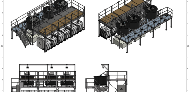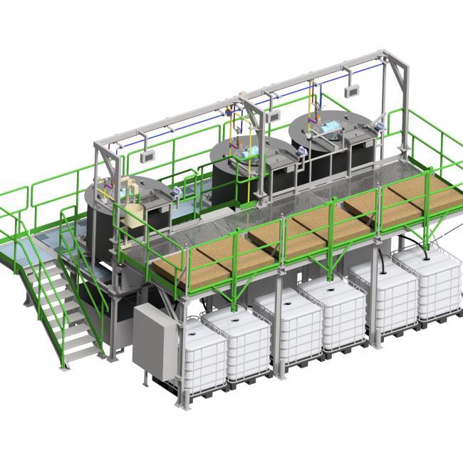 Die Anlage ermöglicht die automatische Entnahme flüssiger Rohstoffe aus IBC-Containern und externen Lagertanks sowie die kontrollierte Dosierung pulverförmiger Komponenten. Je nach Prozessanforderung können pulverförmige Rohstoffe manuell über Aufgabebehälter zugegeben oder über Big-Bag-Entladestationen zugeführt werden. Auch der Transport von Schüttgütern mittels Scheibenförderern oder Schneckenförderern ist möglich, sodass die Lösung an die Eigenschaften des Mediums, die Einbaubedingungen und die Anforderungen der jeweiligen Technologie angepasst werden kann.
