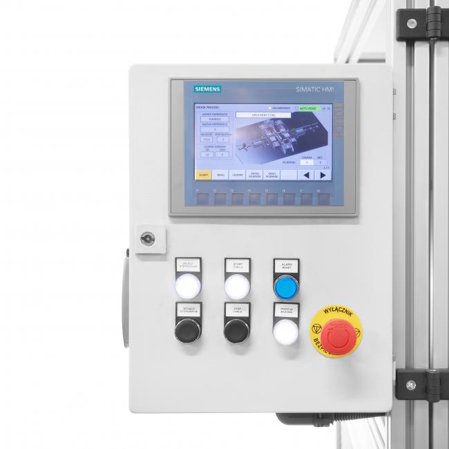 Gemäß den Vorgaben des Kunden und in Übereinstimmung mit den Empfehlungen der Norm PN-EN ISO 12100 ist die Maschine mit einer Reihe technischer Sicherheitsvorrichtungen ausgestattet, darunter: Not-Aus-Schalter, Sicherheitsverriegelungen, magnetische Endschalter, Schutzabdeckungen und Piktogramme.