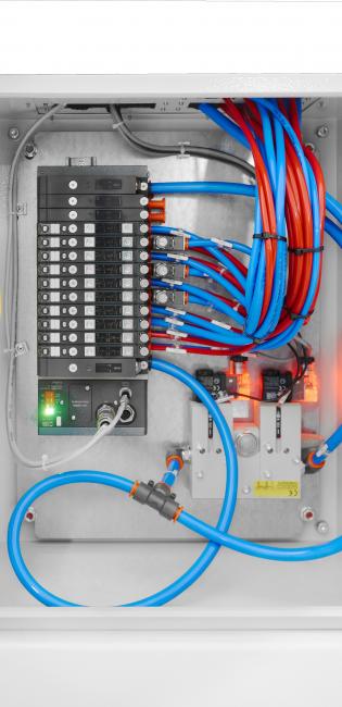 Das Kabelabwickelmodul ist der Ort, an dem das Kraftstoffkabel gesammelt und zum Kabelziehgerät geführt wird. Für den ordnungsgemäßen Betrieb des Abwicklers und die korrekte Führung der Kabel sorgt ein Schwenkarm mit Winkelauslenkungssteuerung. Die Zugangstür ermöglicht einen schnellen Austausch des Materialbehälters.