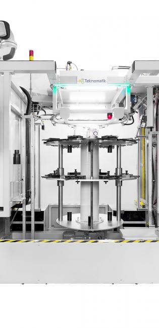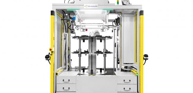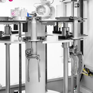 Das Herzstück der Maschine ist der Drehtisch, der auf Basis eines hochwertigen Fibro-Servoantriebs mit einer Positioniergenauigkeit von +/- 30" aufgebaut ist. Aufgrund der unterschiedlichen Längen der Stoßdämpfer ist eine Anpassung der Höhe der mittleren Platte möglich. Die Auf- und Abbewegung erfolgt mittels eines elektrischen Stellantriebs. Die Position wird über das Bedienfeld vorgegeben und kann für jede Referenz gespeichert werden. Auf der oberen Tischplatte sind spezielle Federgreifer montiert, die die Stoßdämpfer halten.