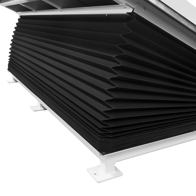 Der gesamte Steuerungsmechanismus ist im Inneren der Maschine unter einer Faltenbalgabdeckung verborgen, was ihn vor Verschmutzungen schützt und verhindert, dass Personen während des Betriebs unter die Plattform gelangen können.