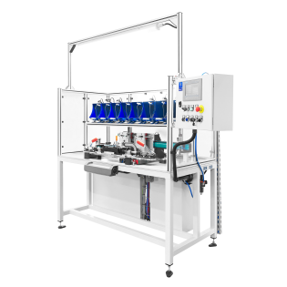 Die Maschine dient zur Montage von Halter-Baugruppen. Die Arbeiten zum Zusammenstellen und korrekten Zusammenbau der Bauteile werden vom Bediener unter Anleitung und Kontrolle der Maschine mithilfe entsprechender Anzeigen und „Pick-to-Light“-Sensoren ausgeführt. Die Vorgänge des automatischen Zyklus, das Nieten und das Crimpen, erfolgen unter Verwendung hochwertiger Antriebseinheiten – zweier pneumatisch-hydraulischer TOX-Zylinder.