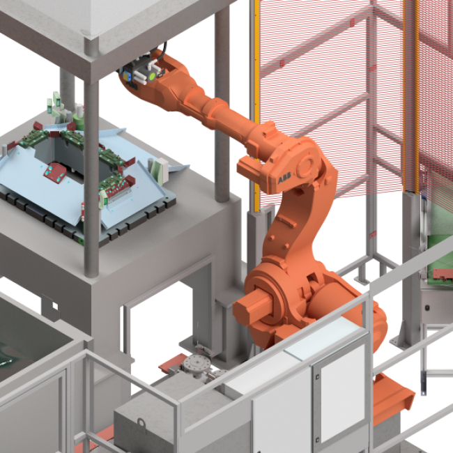Ein dritter Roboter entnimmt die beschnittenen Bauteile aus der Presse und transportiert sie zu einer Station, wo die Bauteile geprüft und mit einem Code gekennzeichnet werden. Anschließend gelangen die Bauteile auf den Förderer für Fertigprodukte.