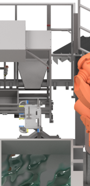 Die Station zur Vorbereitung der Einlegeteile besteht aus einem verfahrbaren Modul mit zwei Körben, in die Einlegeteile zweier Typen gelangen. Der Bediener füllt die Einlegeteile nach, indem er sie über an der Außenseite der Zelle angebrachte Schütten einfüllt.