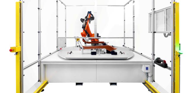 Das Herzstück der Anlage ist ein Drehtisch mit zwei Positionen, der den Dauerbetrieb ermöglicht. Während der Roboter KUKA KR 8 R2010-2 an einer Station den Schneidevorgang ausführt, kann der Bediener das fertige Werkstück sicher entnehmen und das nächste an der zweiten Station vorbereiten.