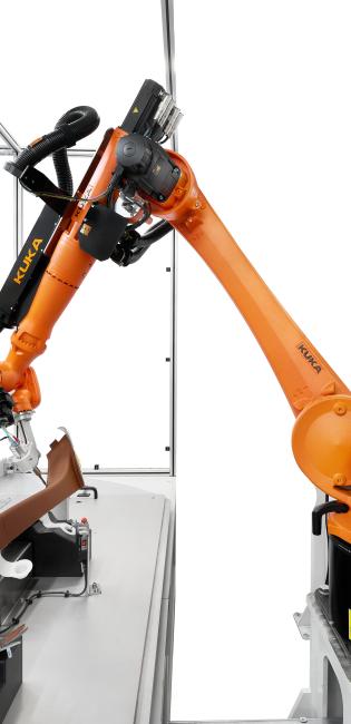 - Bearbeitung: Der KUKA-Roboter KR 8 R2010-2, ausgestattet mit einem Ultraschallmesser an einem Winkelvorsatz, erreicht präzise alle Kanten des Werkstücks.