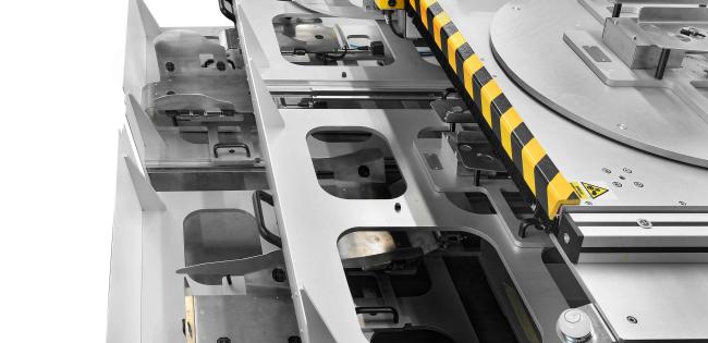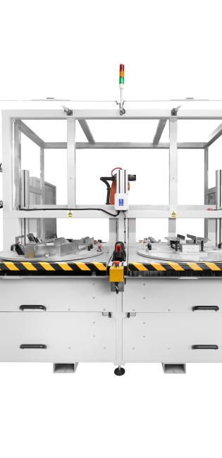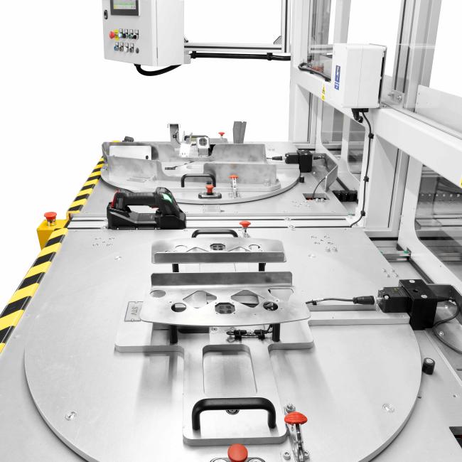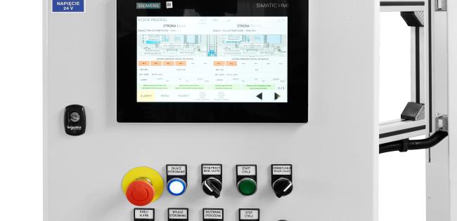 Der Zyklus beginnt damit, dass der Bediener das Werkstück in die Palettenaufnahme der ausgefahrenen Schublade legt. Nach dem Positionieren des Werkstücks startet der Bediener den Vorgang mit der Taste „Start“. Das System überprüft über das HMI-Panel den Status der Positionssensoren; im Falle eines Fehlers erhält der Bediener eine genaue Information darüber, welcher Punkt korrigiert werden muss. Der Start des Prozesses ist nur bei aktivierter Verriegelung des Drehtisches möglich.