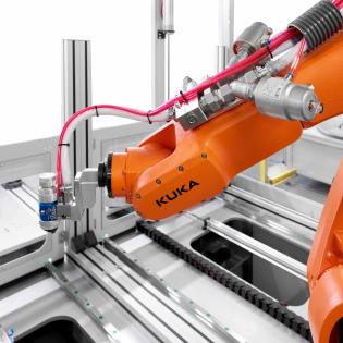 Das Herzstück der Station ist der Industrieroboter KUKA KR 10 R1440-2, der mit einem Graco-Sprühsystem ausgestattet ist. Diese Konfiguration gewährleistet die Wiederholgenauigkeit der Applikation sowie Flexibilität bei der Bearbeitung zahlreicher Produktionsvarianten.