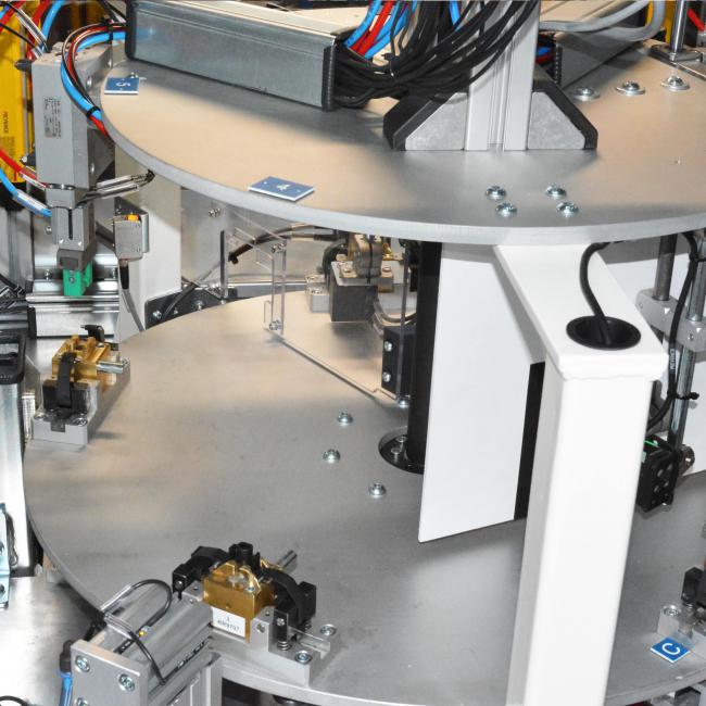 Die Anlage ist mit einem fünffach indexierten Rundschalttisch ausgestattet, auf dem Aufnahmen für die Anschlussstücke montiert sind. Unter dem Tisch befinden sich Module, die das Öffnen der Spannbacken übernehmen und dadurch die korrekte Positionierung des Bauteils sowie den sicheren Weitertransport durch die einzelnen Prozessschritte ermöglichen.